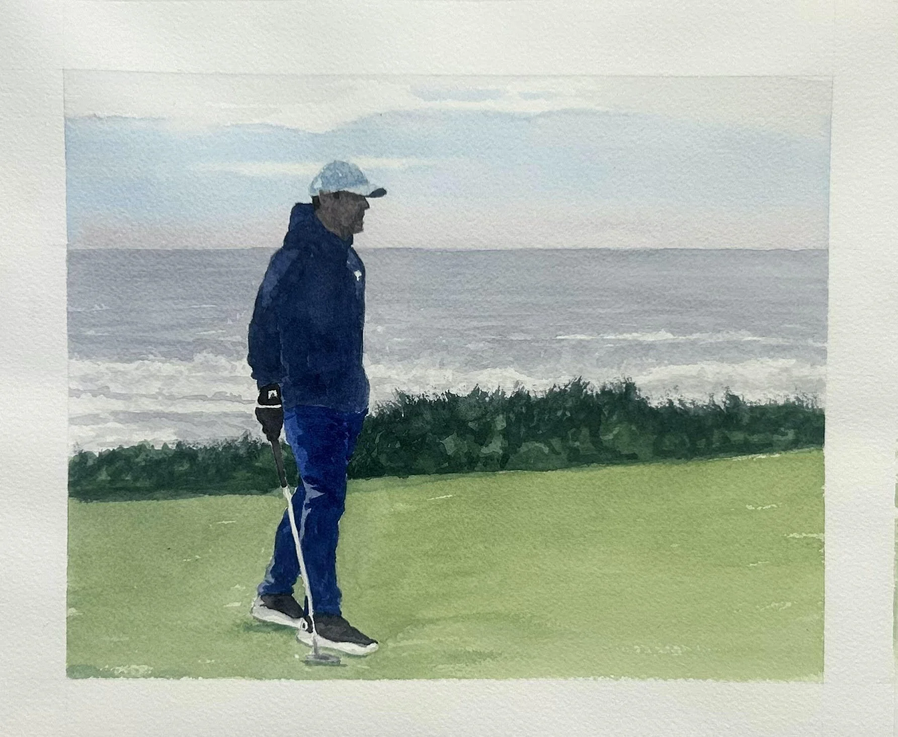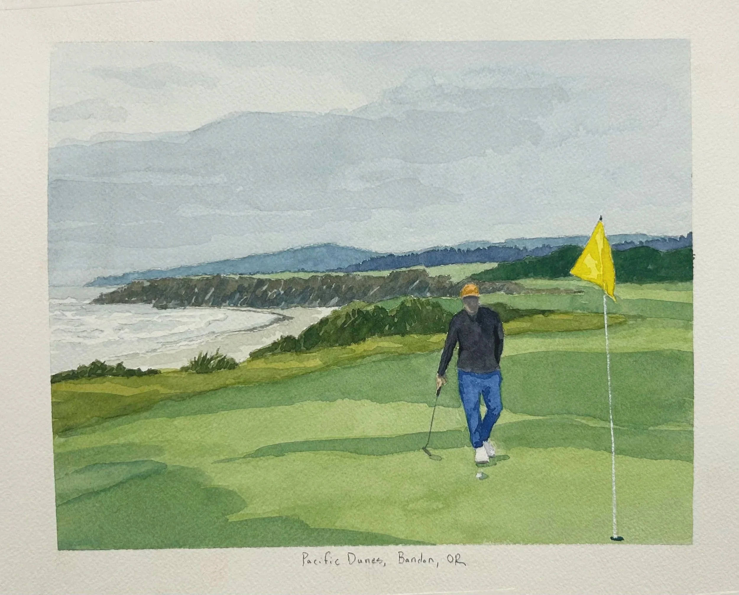 Photos taken on iconic holes — the coastline at Bandon, the dunes at Pinehurst, the cliffs at Pebble Beach — often make especially meaningful paintings.